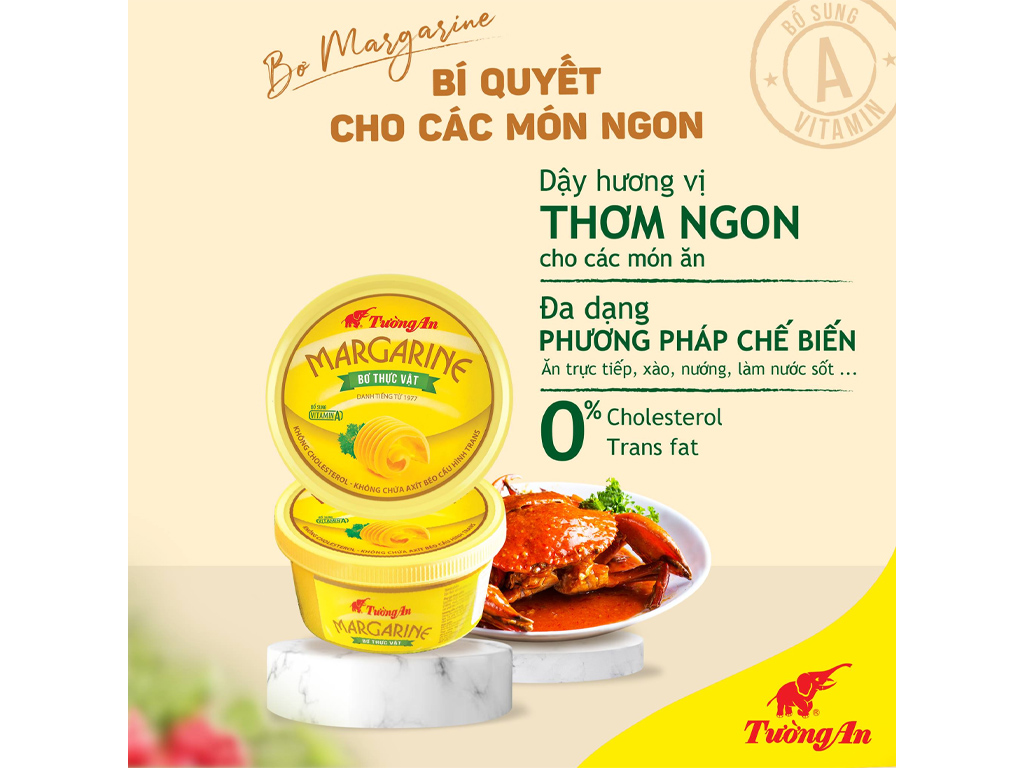Với hương vị đặc trưng được phối trộn theo công thức độc quyền cùng dưỡng chất Vitamin A. Bơ thực vật margarine Tường An hộp 800g đến từ thương hiệu bơ Tường An là loại bơ, thích hợp cho việc chế biến món ăn chiên, xào, làm bánh,... dành cho người ăn chay và ăn mặn.